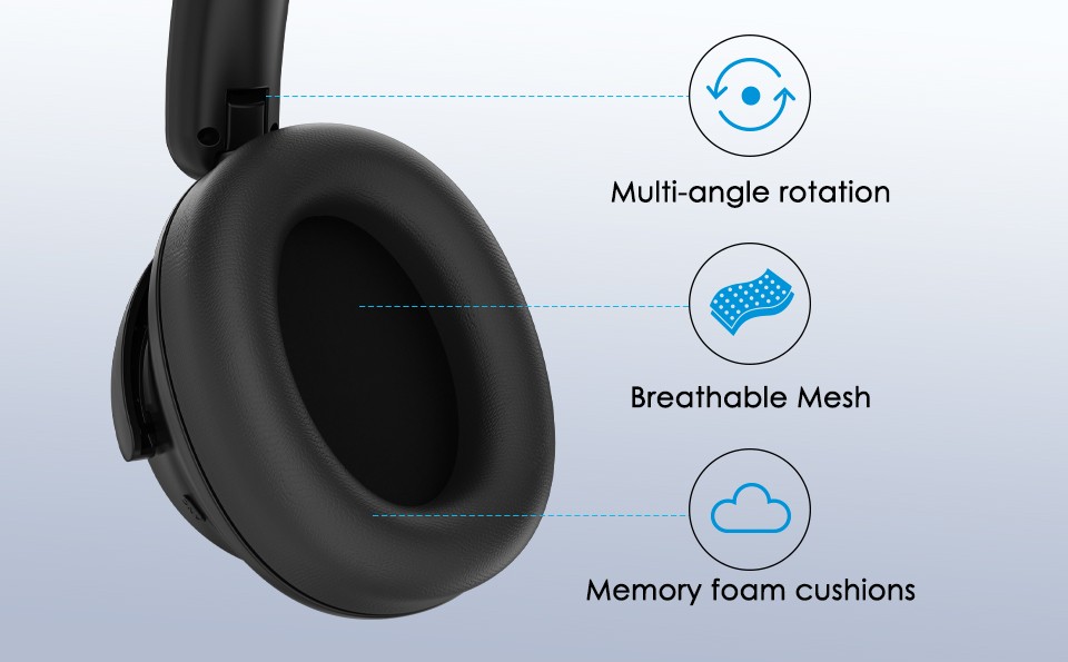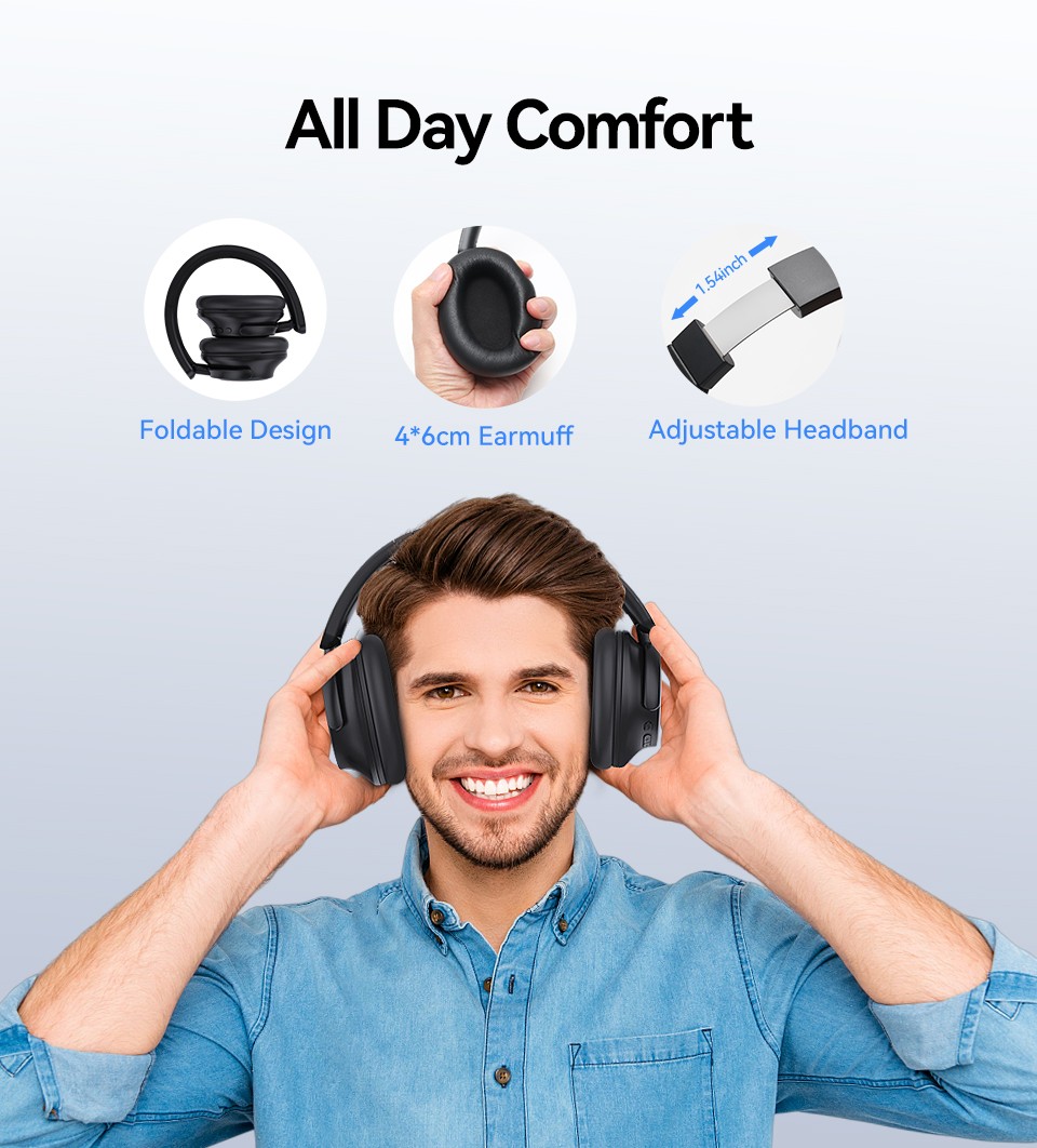 - All-day Comfort & Foldable Design: Ultra-soft memory foam ear cushions ensure outstanding comfort, adjustable headband and durable 90° angled-swivel earcups to find your perfect fit, making the Bluetooth over-the-ear headphones ideal for all-day comfort in long listening sessions. The foldable and lightweight design allows you to easily fold the ANC headphones into backpacks and travel cases to save space, which is perfect for travel, sports, work and home use