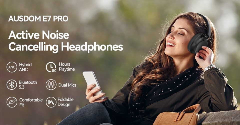 AUSDOM E7 PRO ANC Headphones, Bluetooth 5.3 Over-Ear, 80H Playtime, Hi-Res Audio, Mic - Black