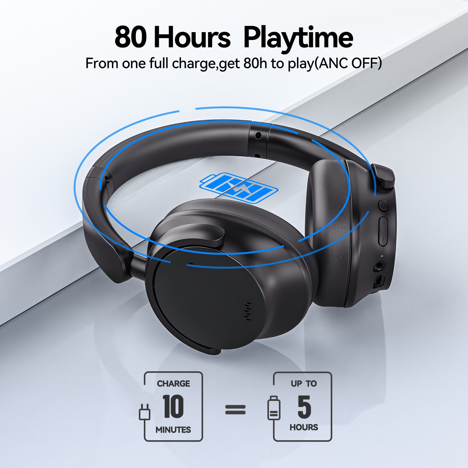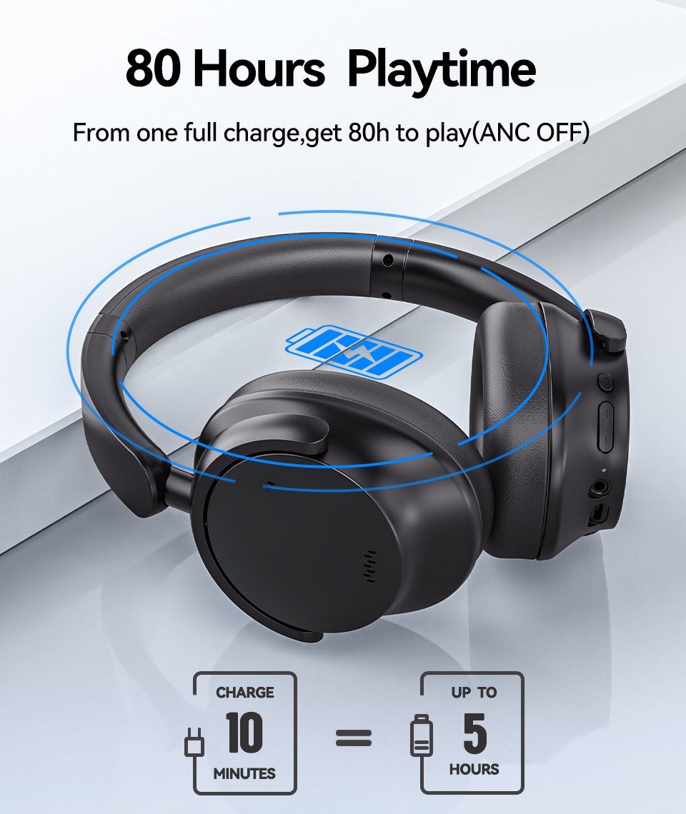 - 80H Playtime & Fast Charging: Experience up to 80 hours of wireless listening time with this wireless noise canceling headphones in ANC OFF mode with a single full charge, giving you the ability to listen to over 1000 songs or multiple long-haul flights. A 10-minute quick charge also provides an additional 5 hours of listening time. Also equipped with a 3.5mm aux cable, you can effortlessly transition to a wired mode when the battery has run out, guaranteeing uninterrupted listening