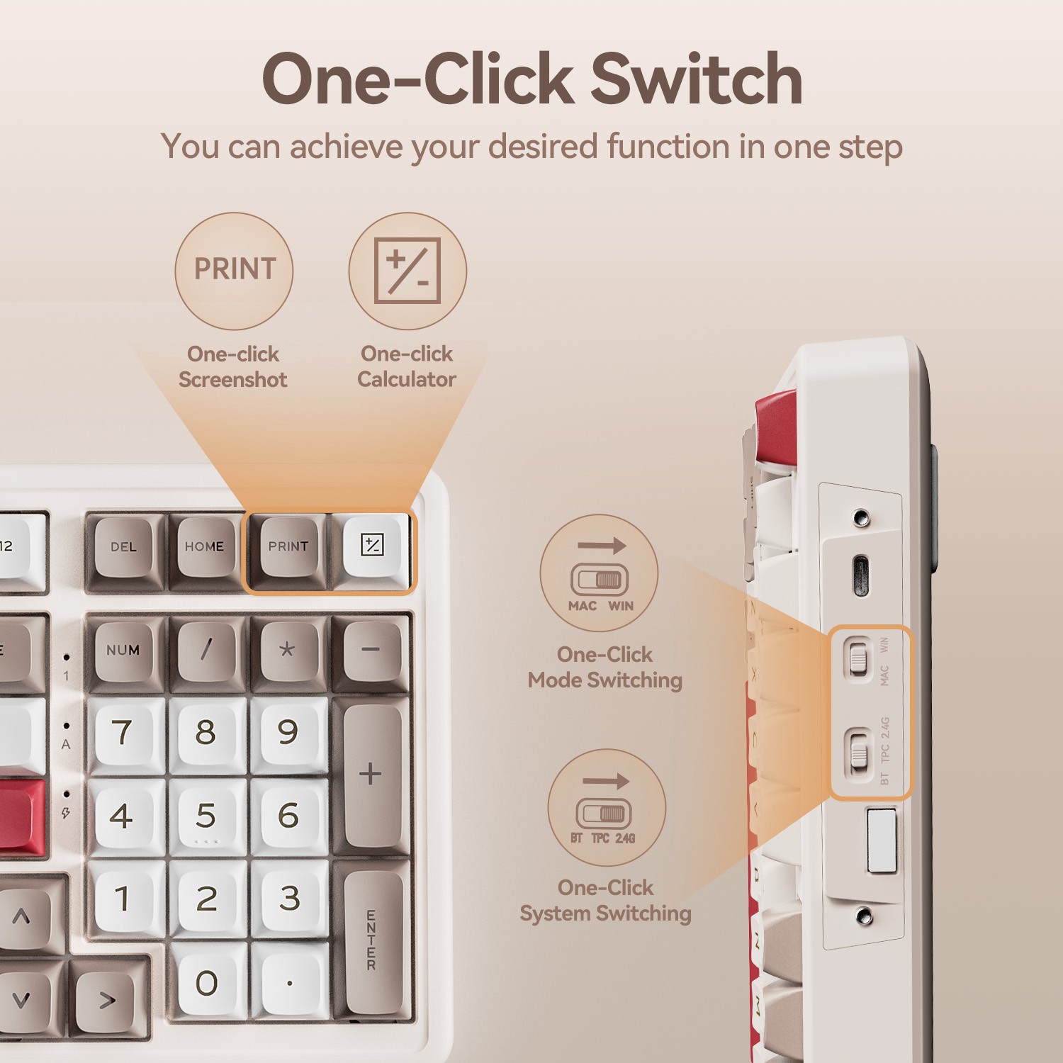 - Numpad & Function Keys: Enjoy seamless versatility with this classic mechanical keyboard, featuring a numpad and function keys in a space-saving design. Instantly switch between Windows & Mac modes, or toggle between Bluetooth, 2.4G, and wired connections with a single button. Boost efficiency with one-click calculator and screenshot shortcuts for smooth, lasting performance. Perfect for work, studying.Note: After unplugging, just switch to TPC to power off.