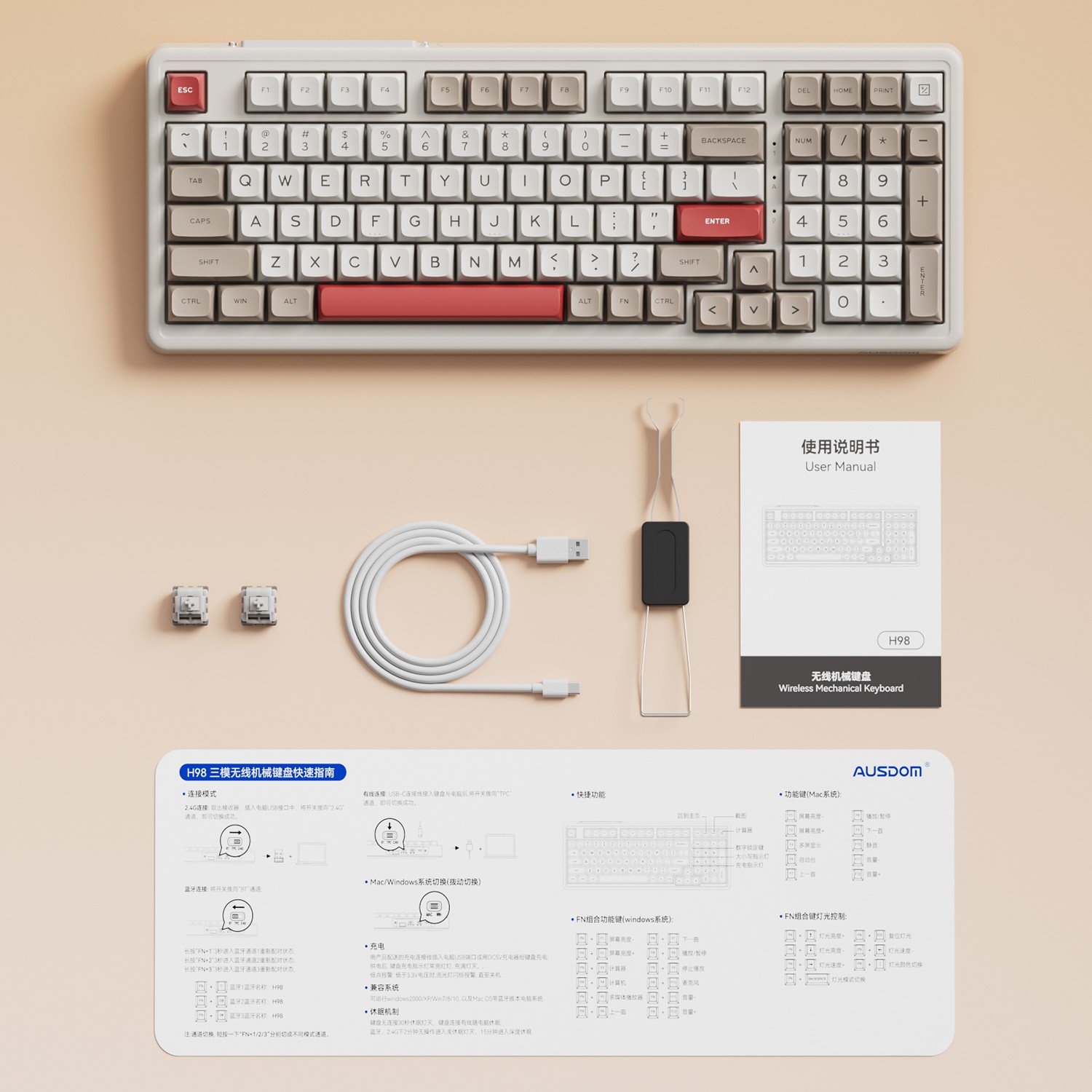 AUSDOM Wireless Mechanical Gaming Keyboard, BT5.3/Type-C/2.4G Hot swappable Gasket Custom Bluetooth Keyboards with RGB Backlit, Numpad, 98 Keys Computer Keyboard for Mac/Win/Work/Study, Gray Classic