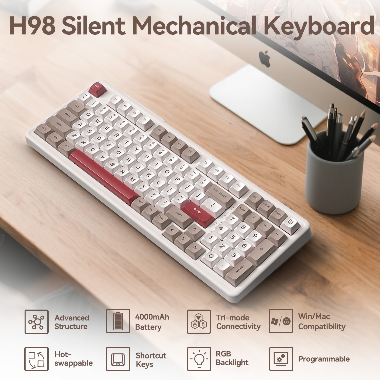 - 4000mAh Battery & MDA Spherical Keycap: Powered by an 4000mAh battery, enjoy extended 32.99-hour backlit on or 300 hours without lighting. Experience premium comfort typing with MDA spherical keycaps cradling your fingertips and adjustable feet (6°-8° tilt) for optimal wrist positioning. This wireless mechanical keyboard delivers ultra-long battery life without compromising comfort or performance. Say goodbye to battery anxiety and wrist strain!