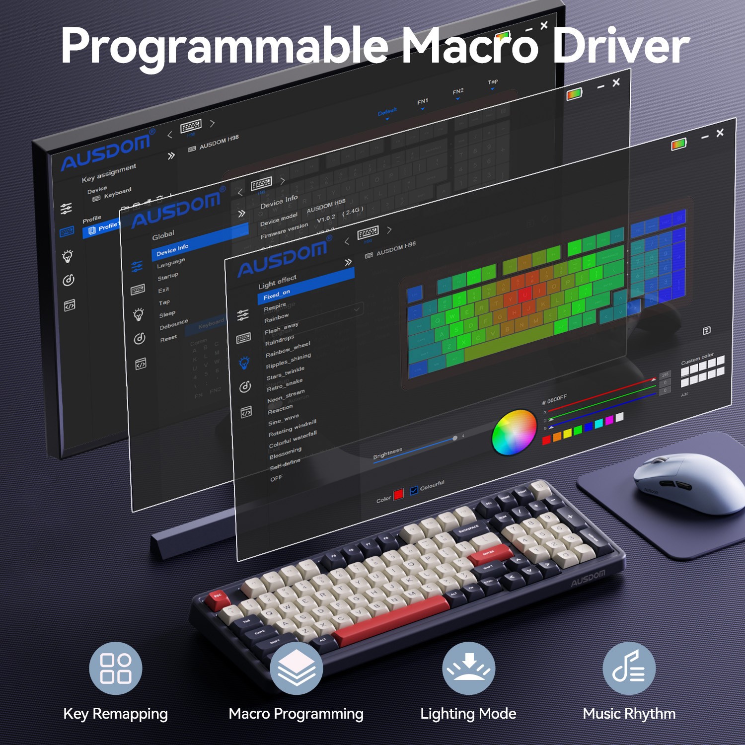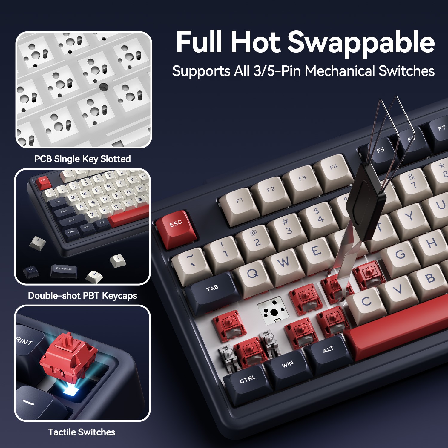 • Hot-swappable & Programmable: The hot-swappable mechanical keyboard features a single-slot PCB construction for enhanced stability and durability, and allows you to easily replace 3/5 pin switches without soldering. Take full control with software customization: remap keys, customize dynamic RGB lighting, and let RGB backlighting dance to your favorite beats. Perfect for DIY enthusiasts and professionals seeking ultimate customization.(Note: The user can only remap keys on Wired Mode and 2.4G Mode in the Windows system. Once it's done, the keymap will work on tri-mode.)