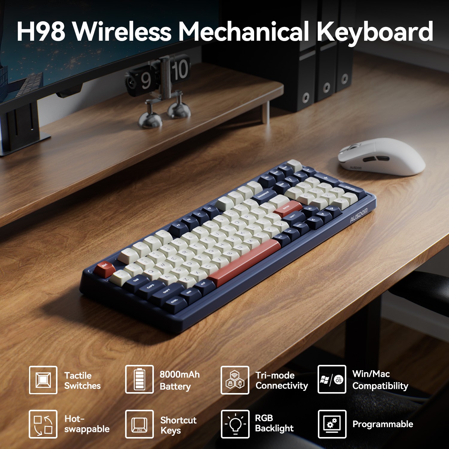 Specifications: Pairing Name: H98 Connection Mode: BT 5.3/2.4G/Wired Layout: 98 (95% TKL) Key Switches: Mechanical Switches Battery Capacity: 8000mAh Battery Type: Lithium-ion Battery Charging Current: DC5V/500mA Compatible Systems: Windows 7/8/10/11/Mac 10.10 and above